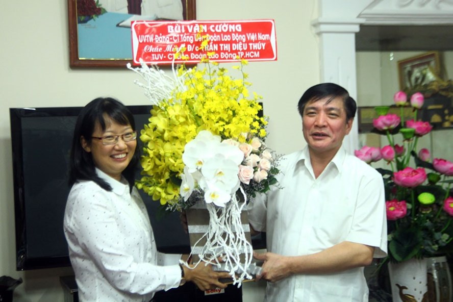 Chủ tịch Tổng LĐLĐVN Bùi Văn Cường tặng hoa cho bà Trần Thị Diệu Thúy – Chủ tịch LĐLĐ TPHCM. Ảnh: PV